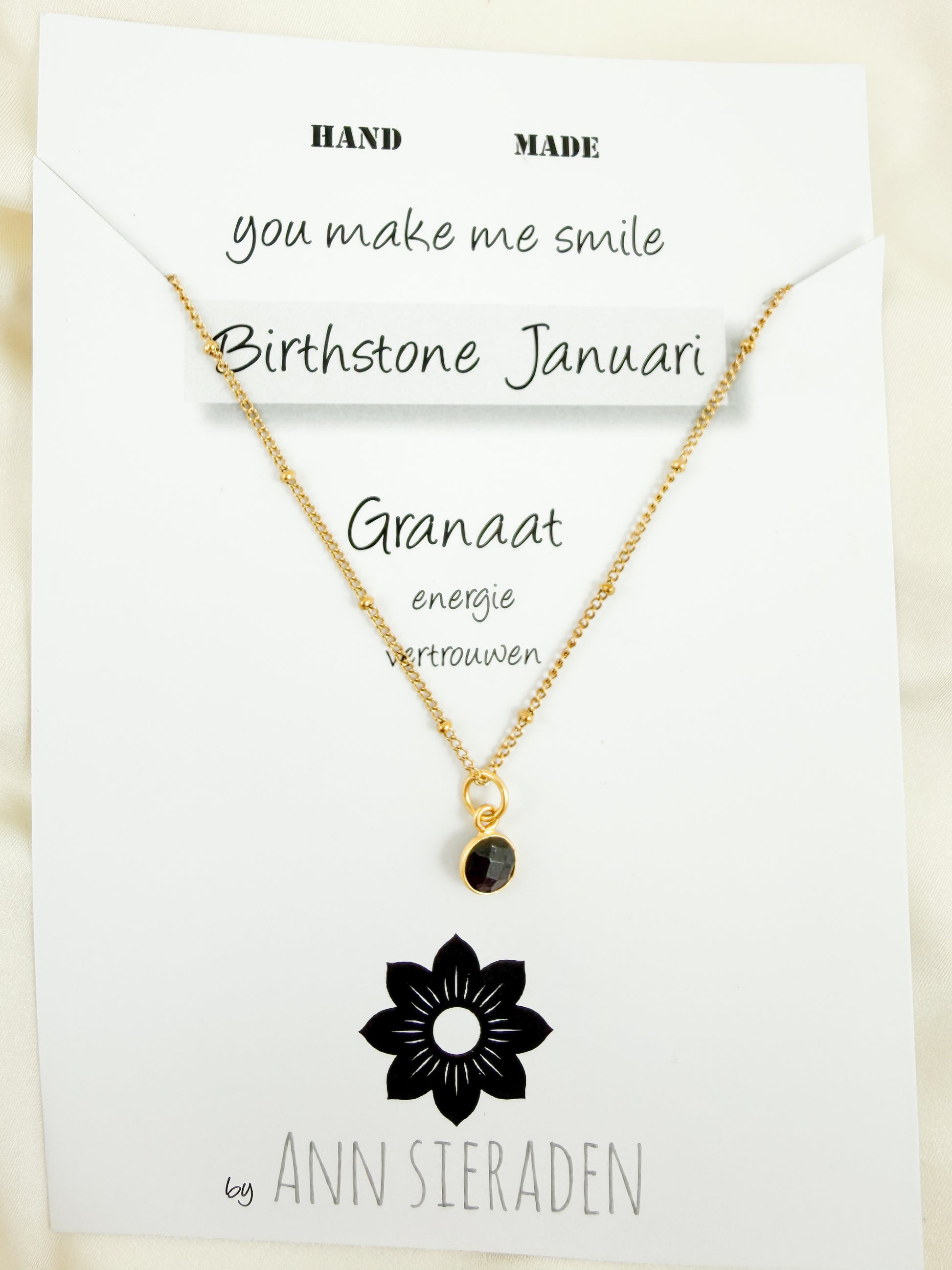 Draag de kracht van vertrouwen en energie met deze prachtige ketting met een granaat edelsteen . Granaat, de geboortesteen van januari, staat symbool voor energie en vertrouwen. Perfect als cadeau voor iemand die in januari is geboren of als betekenisvol sieraad voor jezelf.